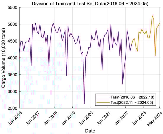 The monthly port cargo throughput time series data of Ningbo Zhoushan Port and Shanghai Port from June 2016 to May 2024 were read and the time series curve was plotted. Figure 2 shows the data for Ningbo Zhoushan Port, where the green section represents the training set data and the blue section represents the test set data. Figure 3 displays the data for Shanghai Port, with the purple section indicating the training set data and the orange section indicating the test set data. From the curve graph, it can be initially determined that the time series is non-stationary. Next, the ADF (Augmented Dickey–Fuller) test will be used to verify this observation.