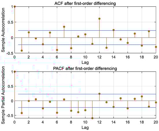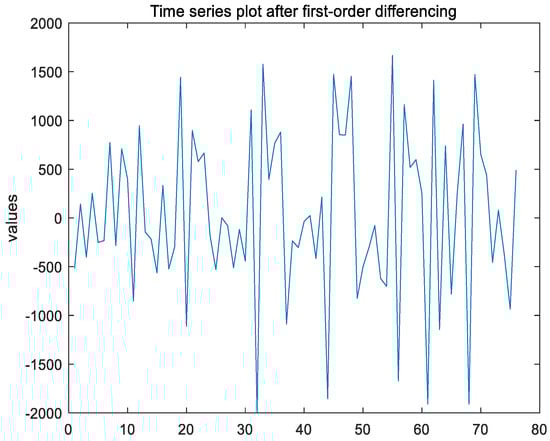 After the first-order differencing of the non-stationary time series, the ADF test result of the time series shows that h = 1, indicating that the series has been stabilized; the p-value is 0.0010, which is significantly lower than the 0.05 significance level, thereby strongly rejecting the null hypothesis; the test statistic is −13.4639, which is considerably less than the critical value of −1.9446 at the 1% significance level, which indicates that the time series has been stabilized through first-order differencing, leading to d = 1. The time series plot after first-order differencing is shown in Figure 4 below.
