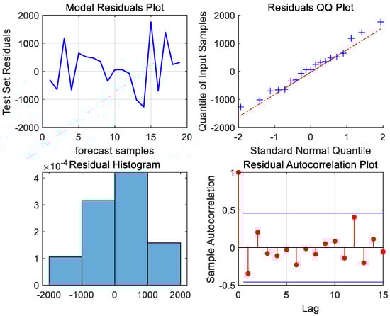 Next, the model residuals must be tested for white noise to ensure that the useful information of the port throughput time series has been adequately extracted by the developed ARIMA (2,1,1) model. From the QQ plot of the residuals and the histogram of the normal distribution of the residuals in Figure 6, it can be seen that the scatter distribution is near the fitting line, the shape of the histogram conforms to the normal distribution, the autocorrelation coefficients of the residual sequences are within the confidence intervals, and the residuals are shown to be a random sequence. To further assess the presence of white noise in the model residuals, the Ljung–Box test was conducted. The resulting p-value of 0.8582, which is greater than 0.05, confirms that the residuals are white noise sequences. This indicates that the model has successfully extracted the useful linear information, leaving only the random perturbation information that cannot be extracted by the ARIMA model.