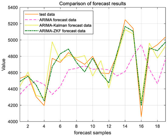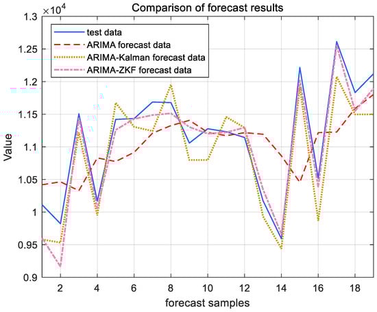 ARIMA, ARIMA–Kalman, and ARIMA-ZKF models’ forecast results for Shanghai Port.