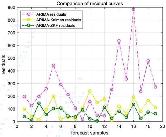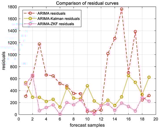 ARIMA, ARIMA–Kalman, and ARIMA-ZKF models’ forecast residual plots for Ningbo Zhoushan Port.