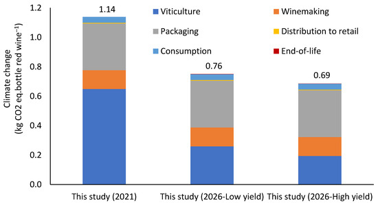 The PEFCR [11] suggests that wine is refrigerated for a couple of days, and 5% of the wine in the bottle is not consumed, but becomes waste. This effect is small and ranges between approx. 4% and 6% for the 2021 yield and 2026 high yield, respectively. Additionally, bottled wine distribution to retail occurs at a local level. If distribution changes and wine is distributed nationally or exported to North European countries by truck for approx. 2500 km, the climate change score may increase by 7% on average or 24%, respectively.