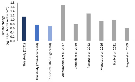 Local climatic conditions greatly affect agriculture yield and taste [19] and, consequently, the climate change score of produced wine. Climatic conditions and farming practices are crucial for the materials and energy used in the viticulture stage, as well as agricultural yield. There are five studies that calculated the climate change score of organic red wine production in the Mediterranean region. Among them, only the study by Harb et al. (2021) [20] applied the “Product footprint environmental category rules”, PEFCR, for wine. Three LCA studies regarded Italian wines, one study regarded Spanish wine, and one study regarded Lebanese wine. The average climate change score is 1.05 kg CO2 eq. bottle wine−1. The bottle making and packaging stage is the largest contributor to climate change. However, even though these LCA studies regarded organic farming practices, the consumption of diesel (for machinery), organic fertilizers, and insecticides resulted in a varying contribution from the viticulture stage to the climate change score. Furthermore, these studies show that the distribution stage may contribute depending on the distance between the winery and the retail market. Table 1 presents the key aspects of the reviewed LCA studies of organic red wine.