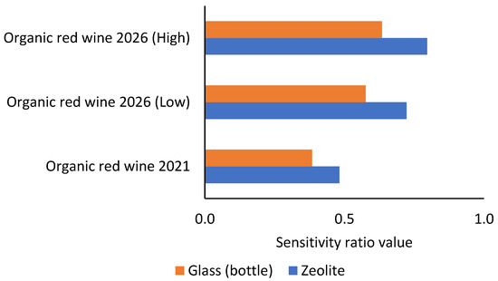 The input parameters that were analyzed with the perturbation analysis were zeolite production and packaging glass material because both are hotspots according to Figure 2. In Figure 4, the effect that parameters have on each designed systems is displayed. This analysis shows that increasing the zeolite and glass input values by 10% results in positive SR values; thus, an increase of 10% results in an increase in the climate change value. A 10% increase in zeolite and glass results in increasing the climate change value from 4.8% to 8% and from 3.8% to 6.3%, respectively. The relative effect that the two input parameters have on the climate change score is greater for the organic red wine 2026 systems because their climate change values are smaller than the climate change score of the 2021 system.