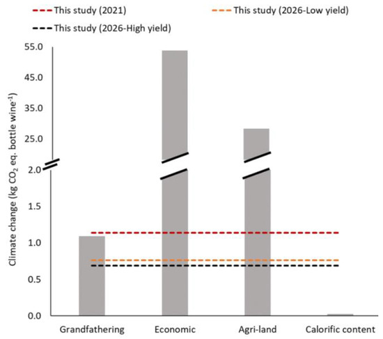 Regarding both low and high yields in 2026, the carbon emissions of a bottle of wine result in exceeding the maximum SOS value calculated with the caloric content partitioning and remaining within the SOS with the grandfathering, economic, and agri-land partitionings. A bottle of wine in 2026 with low yield results in higher carbon emissions than the maximum SOS value of the caloric content partitioning by 0.89 kg CO2. However, the total carbon emissions remain within the SOS by 0.18, 52.91, and 27.34 kg CO2 based on grandfathering, economic, and agri-land partitionings, respectively. Similarly, a bottle of wine in 2026 with high yield results in higher carbon emissions than the maximum SOS value of the caloric content partitioning by 0.82 kg CO2. In addition, the total carbon emissions remain within the SOS by 0.25, 52.98, and 27.41 kg CO2 based on the grandfathering, economic, and agri-land partitionings, respectively. For both future yields, the difference in the carbon emissions of a bottle of wine with the maximum SOS value of the grandfathering and caloric content partitionings approximates the climate change score of the winemaking stage or the climate change score of the “greener” wines of Figure 3. In contrast, the difference in the future yields’ carbon emissions with the maximum SOS value of the remaining partitioning methods is several times the climate change score of wine, i.e., exporting the wine, even to north European countries or Australia, may not result in crossing the climate change boundary.
