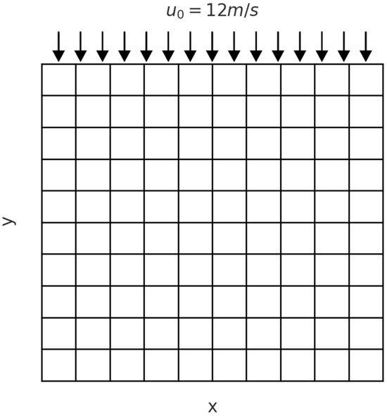 The wind regime considered is unidirectional, consistently blowing from the north at a fixed speed of 12 m/s, as depicted in Figure 1. These parameters were chosen to model realistic conditions and provide a robust framework for evaluating the performance of the proposed optimization methodology. However, assuming a constant and unidirectional wind is a notable simplification, as wind direction and speed vary in real-world conditions. These limitations should be considered when interpreting the results. Nevertheless, this assumption remains relevant in our case study as it allows for an adequate assessment of the proposed optimization methodology while maintaining a balance between accuracy and computational feasibility.