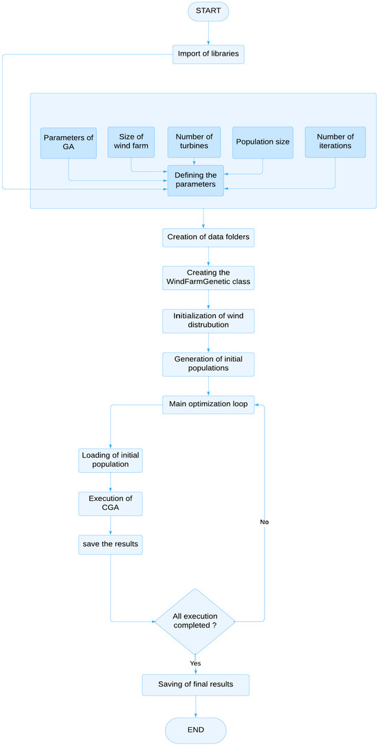 Figure 4 provides a broader view of the optimization process, detailing how the GA integrates various evaluation criteria to iteratively refine the wind turbine layout. This flowchart highlights the optimization process.