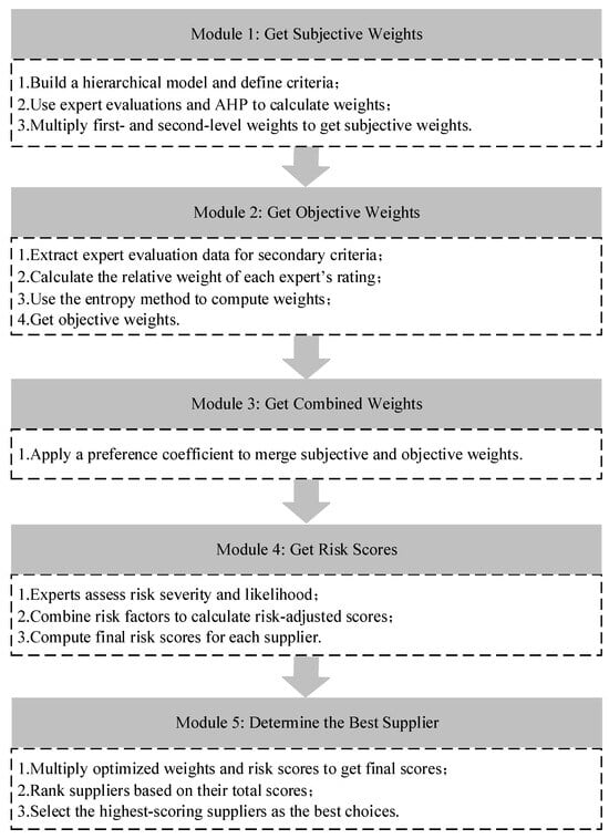 - Finally, the combined weight , risk score , and baseline score are multiplied to compute the comprehensive score for each secondary criterion. The suppliers are then ranked based on their aggregated secondary criteria scores, with higher scores indicating better-performing green suppliers, Figure 1 shows the relevant steps of modeling: