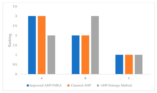 This section presents a comparative analysis of several existing methods, including the classical AHP [37] and the AHP-Entropy method without considering risk factors [38], in order to demonstrate the effectiveness of the proposed improved AHP-FMEA method. The ranking results for green supplier selection obtained using these methods are shown in Figure 2:
