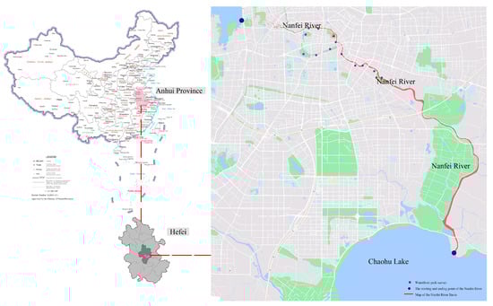 Hefei is located at 117°17′ E and 31°52′ N, in a region characterised by hot summers and mild winters, which falls under the subtropical monsoon climate. The high-temperature season typically lasts from June to August, with average monthly temperatures ranging from 25 °C to 36 °C and peak temperatures reaching between 36 °C and 38 °C. During the summer, the prevailing wind direction is from the southeast. Hefei has a well-developed water system, bounded by the Jianghuai Watershed, with the Huaihe River system to the north of the ridge and the Yangtze River system to the south of the ridge, in which the Nanfang River in the Yangtze River system runs north and south through the urban area of Hefei (Figure 1), with a length of 70 km and a watershed area of 1700 square kilometres, and it is the main river channel connecting the urban area with the western half of Chaohu Lake, and the Nanfang River is an ecological corridor within the urban area of Hefei. The waterfront parks along the river are important outdoor activity spaces for citizens’ summer activities, among which the ribbon waterfront parks are the most common forms of waterfront spaces. The ribbon waterfront parks along the Nanfei River in the main urban area of Hefei are selected as the research object, and Figure 1 is the location map of the research area and the distribution map of the waterfront parks researched in the present study.