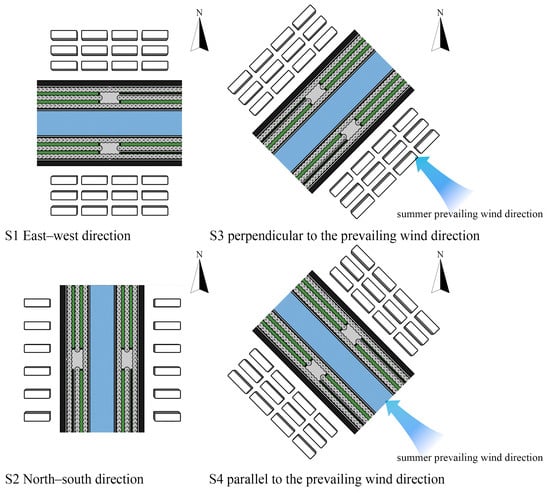 - Factor S: Water Body DirectionThe direction of the water body is determined according to the actual flow of the Nanfei River through Hefei City, in relation to the dominant wind direction. Four conditions are set: east–west direction, north–south direction, perpendicular to the wind direction, and parallel to the wind direction (Figure 4).