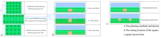 Figure 5. Illustration of each factor level. - Factor B: Forms of Distribution of Squares in the ParkThe research found that the square activity space in the waterfront park is primarily divided into a large centralised square and decentralised small-area activity squares. In accordance with the norms, the proportion of the park’s pavement area is set to 25%. The total paving area remains unchanged and is arranged in two forms: centralised (a single large square) and decentralised (two smaller squares) (Figure 5c).