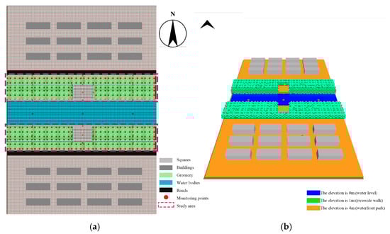 This study focuses on the typical city of Hefei, located in a region characterised by hot summers and cold winters, to analyse and research the ribbon waterfront park. By summarising several waterfront parks in Hefei, a typical model of the Hefei ribbon waterfront park was constructed. Statistical analysis reveals that the average length-to-width ratio of the ribbon park is 6:1. The Nanfei River flows through the city, averaging 50 m in width, while the parks on both sides of the river also average 50 m in width. Most surrounding buildings are multistorey structures arranged in rows, with a north–south orientation. The water body direction and the dominant wind direction are parallel to the building orientation, aligning with the river. The typical ribbon waterfront park model consists of two ribbon parks (each 300 m in length and 50 m in width) distributed on both sides of the river. On the long side of the park, city roads and residential areas are located, while a bridge connects the two sides of the park area on the short side. A 3 m wide walkway runs along the riverfront, creating a 3 m elevation difference with the park. The proportion of land allocated to garden paths and paved areas is 25%. The plant structure follows a tree–shrub–grass composite pattern, and the park includes a designated activity square. Analysis of data extracted from satellite maps indicates that the canopy coverage rate of the waterfront park ranges from 40% to 90%, with an average canopy coverage rate of 61.93%. According to the Specification for Landscaping Engineering Projects GB55014-2021 [], for parks with a land area of less than 2 hectares, the proportion of land used for garden paths and paved areas should be between 10% and 30%.