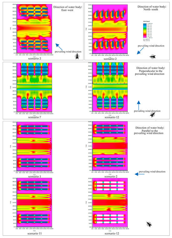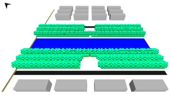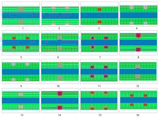 Based on the level parameters of the above factors, the ENVI-met model was established (Figure 6 provides an example of Scenario 5). Red markers in the figure indicate monitoring points (sensors), which were arranged to account for different offshore distances (0 m, 15 m, 30 m, 50 m, and above the water body) and various types of outdoor spaces (shaded green areas, squares, boulevards, and riverfront walkways). Control groups with no water body and no greenery were established under each of the four water body direction layouts. The floor plans of the 16 orthogonal test scenarios are shown in Figure 7.