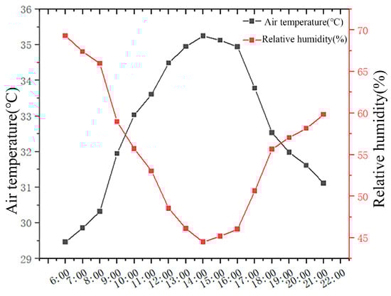 Temperatures throughout the day exhibited a typical diurnal pattern, as shown in Figure 8, with a trend of increasing and then decreasing. The lowest temperature (29.5 °C) occurred at 06:00, gradually rising as the sun rose and reaching a maximum of 35.2 °C at 14:00. Subsequently, temperatures began to decline, reaching 30.9 °C as sunlight weakened. In contrast, relative humidity showed a decreasing and then increasing trend throughout the day, peaking at 70% at 06:00, gradually decreasing to a minimum of 44.5% at 14:00, and then increasing to 61% during the night.