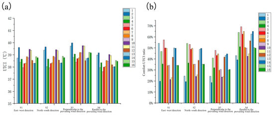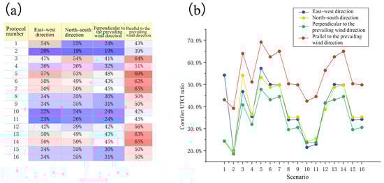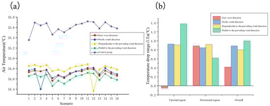 (a) The temperature of each scenario in different directions at 14:00; (b) comparison of the cooling rates in the upper and lower wind zones in different directions.