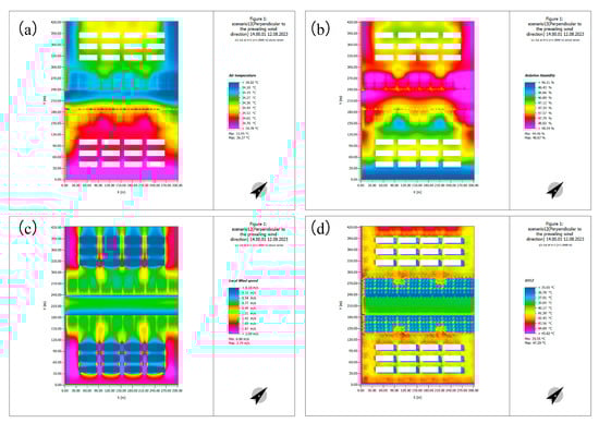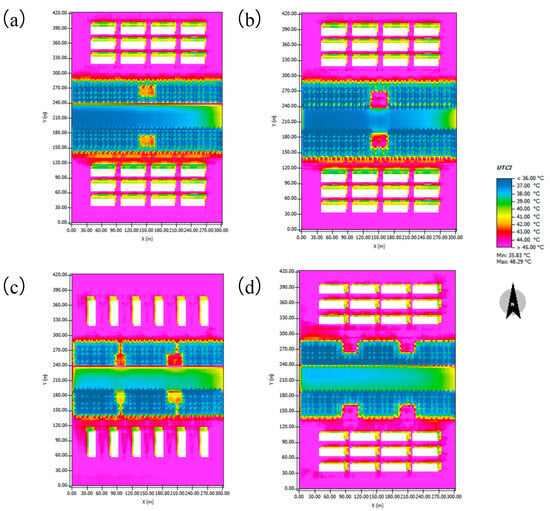 Air temperature, relative humidity, wind speed, and UTCI distribution of Scenario 12: (a) air temperature distribution; (b) relative humidity distribution; (c) wind speed distribution; (d) UTCI distribution.