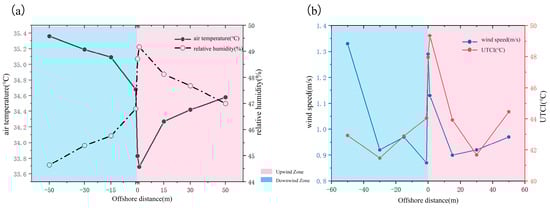 Microclimate indicators, thermal comfort variations at different distances from shore: (a) changes in air temperature and relative humidity; (b) changes in wind speed and UTCI at different distances from the shore.