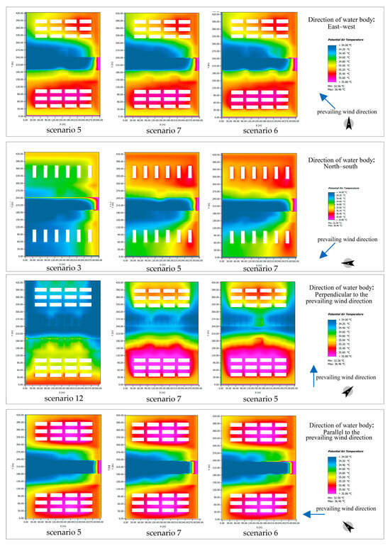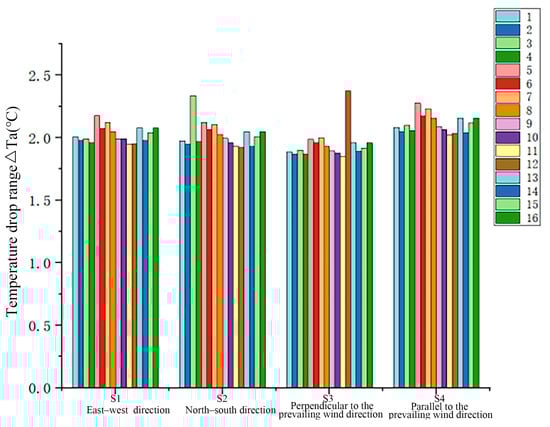 The average air temperature of the waterfront park at 14:00, the hottest moment in the simulation, was analysed under different water body directions. The difference in air temperature, calculated using simulation data from the control group, represents the cooling effect of different scenarios. A larger temperature difference indicates a better cooling effect.