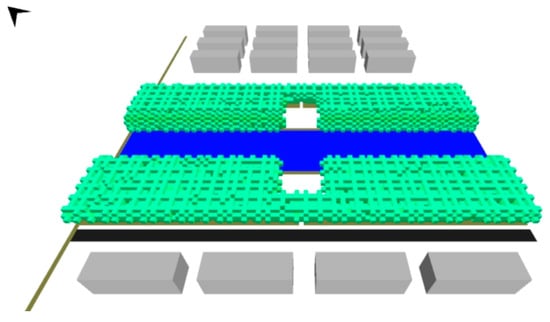 Based on thermal environment test research, pre-experiments, and previous studies [,,], this study selects five variables as research factors: water body direction, density and form of tree planting [,], forms of distribution of squares in parks, location of the square in the park, and pavement material. The influence of these five factors on summer microclimate and thermal comfort is explored through comparative analyses, focusing on the perspectives of the water body, plants, and pavement. The experimental factor levels were set as shown in Table 2. The direction of the water body is set in four orientations. The simulation results of various scenarios under different water body directions are compared and analysed to derive the optimal microclimate and thermal comfort scenarios, further exploring the waterfront park space. The specific factors are selected as follows: