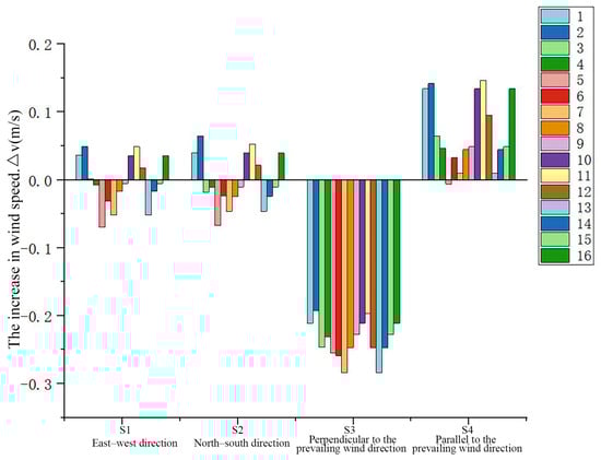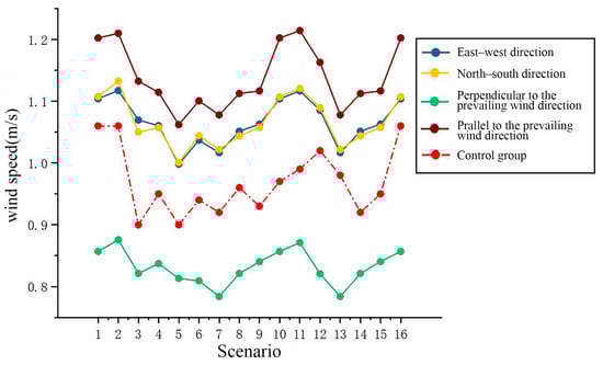 For the east–west, north–south, and parallel-to-wind directions, the average air temperature values for tree planting density and form levels k1, k3, and k2 (corresponding to canopy coverages of 80%, 70%, and 50%, respectively) follow the trend k1 < k3 < k2. This indicates a negative correlation between tree planting density and air temperature, with higher densities resulting in lower temperatures []. In the perpendicular-to-wind direction, the trend is k3 < k1 < k2, indicating a non-linear relationship between planting density and air temperature. The lowest temperatures occur at moderate planting densities, with uniform 10 m spacing yielding the lowest recorded temperatures. This is because the tangential arrangement of tree canopies facilitates air circulation, reducing air temperature in the perpendicular-to-wind scenario. Thus, a planting spacing and crown ratio of 1:1 are optimal, a finding consistent with the studies by Huang Y and Zhang L [,,,].