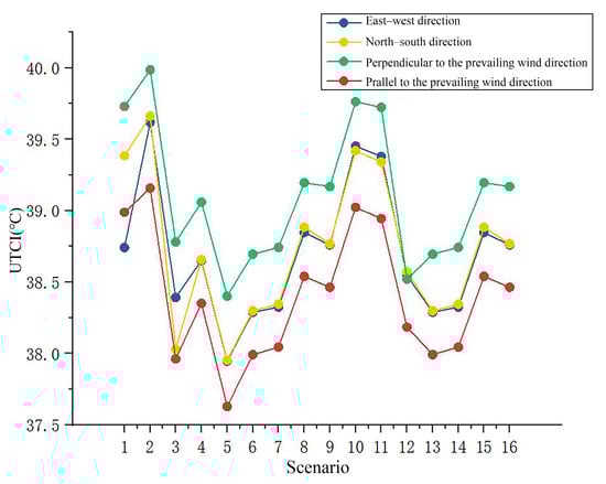 According to the orthogonal test results (Table 8), the ranking of factors influencing air temperature in the east–west direction, perpendicular to the wind direction, and parallel to the wind direction is RA > RD > RC > RB, indicating that tree planting density and form have the greatest impact, followed by pavement material, square position, and square layout form. In the north–south direction, the ranking shifts to RA > RC > RD > RB, meaning tree planting density and form remain the most influential, followed by square position, pavement material, and square layout form. Across all scenarios, tree planting density and form exert the most significant influence on air temperature. As Cameron et al. [] and Shashua-Bar [] found, shading accounts for 60% and 80% of the total cooling effect of trees, respectively, and optimising the distribution pattern of buildings and trees can significantly enhance shading effectiveness [].
