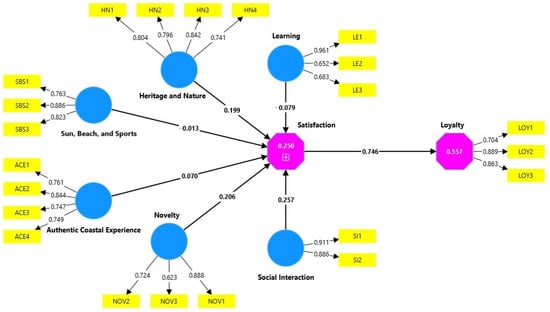 For the loyalty (LOY) construct, the model explains 55.7% of its variance (R2 = 0.557), representing a strong level of predictive accuracy. This result implies that more than half of the variance in loyalty is effectively explained by antecedent variables, particularly satisfaction. The high R2 value for loyalty underscores the model’s ability to capture the critical factors driving tourists’ intentions to return, recommend, or spread positive word-of-mouth about the destination (see Table 2 for details).