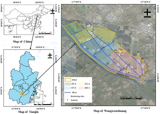 The study area is located in Wangwenzhuang (WWZ), a small town in the southeastern part of the Xiqing District, Tianjin, China, spanning coordinates 38°51′ to 39°51′ N and 116°51′ to 117°20′ E, with a total administrative area of 116 km2 (Figure 1). Characterized by a temperate continental monsoon climate, the region experiences an average annual temperature of 13.6 °C, with over 75% of its annual precipitation occurring between June and September. The area features a dense river network comprising three secondary rivers—Jingang River (JG), Hongni River (HN), and Xingchilong River (XC)—as well as nine tributaries, including the Chilong River (CL), Dongpaigan River (DP), Jieliu River (JL), Jianxinpaigan River (JX), Machangjian River (MJ), Sanba River (SB), Xiaowu River (XW), Yuejin River (YJ), and Zhongxin River (ZX). In addition, five pumping stations have been constructed along the Duliujian River to facilitate flood drainage during the rainy season. The study area is further delineated into four catchment areas, namely, the Jianxinpaigan catchment area (JXCA), Xingchilong catchment area (XCCA), Chilong catchment area (CLCA), and Machangjian catchment area (MJCA), on the basis of the flow directions and locations of the pumping stations. Details on point source pollutant wastewater discharge and non-point source pollutant discharge are outlined in Table 1. Non-point source pollutants from crop agriculture predominantly occur in the MJCA and CLCA catchment areas, whereas aquaculture activities are concentrated in the XCCA and CLCA regions. Serving as a significant rice cultivation hub in Tianjin, cultivated land is the predominant land use type in WWZ. The rural domestic sewage in JXCA and XCCA is managed by small, centralized treatment facilities. Within the MJCA, 30 industrial enterprises operate (73.2%), with the majority involved in key polluting industries such as metal surface treatment, metal smelting and processing, and inorganic salt manufacturing. Notably, industrial and domestic wastewater discharges in this catchment area account for 94.96% and 88.11%, respectively. Municipal sewage treatment facilities adequately treat these discharges before release. However, the process of urbanization in WWZ has created numerous challenges for the water environment.