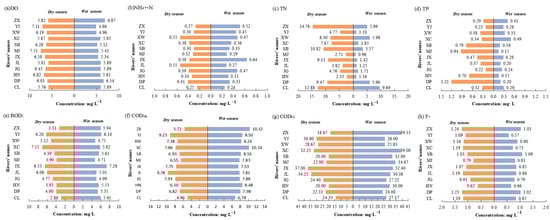 Dry season and wet season comparisons for 12 rivers’ distribution characteristics: (a) DO, (b) NH4+-N, (c) TN, (d) TP, (e) BOD5, (f) CODMn, (g) CODCr, and (h) F− during 2022. Where Zhongxin River (ZX), Yuejin River (YJ), Xiaowu River (XW), Xingchilong River (XC), Sanba River (SB), Machangjian River (MJ), Jianxinpaigan River (JX), Jieliu River (JL), Jingang River (JG), Hongni River (HN), Dongpaigan River (DP) and Chilong River (CL).