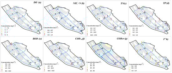 Eight water quality parameters were selected for integrated analysis to comprehensively assess the pollution sources, contamination levels, and health conditions of the water bodies in this study area. Specifically, dissolved oxygen (DO), five-day biochemical oxygen demand (BOD5), the permanganate index (CODMn), and chemical oxygen demand (CODCr) were employed to evaluate organic pollution from domestic sewage and industrial discharges [19,20]. Nutrient indicators, including total nitrogen (TN), ammonium nitrogen (NH4+-N), and total phosphorus (TP), were used to characterize the nutrient status and eutrophication risk of water bodies [21,22]. Given the presence of industrial pollution sources in the study area, fluoride ions (F−) were specifically introduced as characteristic pollutant indicators to assess inorganic pollution. This parameter system is grounded in a robust scientific rationale and provides critical data support for pollution source apportionment and the formulation of urban water environment management strategies [23].