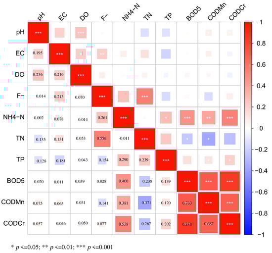 To enhance the accuracy of the analytical process, a variable exhibiting no significant correlation with the other indicators was excluded from further analysis [31,37]. Pearson’s correlation coefficient results, results, as shown in Figure 4, revealed several noteworthy patterns among the eight water quality parameters. Strong positive correlations (p ≤ 0.001) were observed among NH4+-N, CODMn, CODCr, and BOD5. Specifically, CODCr and BOD5 exhibited a significant positive correlation (r = 0.768, p ≤ 0.01), indicating that the organic pollutants in the water bodies of the study area share common sources. F− was significantly positively correlated with TN, CODMn, NH4+-N, and TP (p ≤ 0.01). Given that F− originates primarily from industrial wastewater, it was preliminarily inferred that industrial wastewater has a certain effect on TN, CODMn, NH4+-N, and TP in the region. Additionally, the positive correlation coefficients between TP and CODMn (0.263) and CODCr (0.195) suggested that phosphorus pollution may co-occur with organic contaminants, likely originating from rural domestic sewage and agricultural non-point source runoff. A significant negative correlation was observed between CODCr and TN (r = −0.235, p ≤ 0.01), leading to the preliminary hypothesis that the primary source of nitrogen in the water bodies of the study area is inorganic nitrogen (e.g., agricultural fertilizers or industrial wastewater), which may simultaneously dilute organic pollutants in the water. TN was negatively correlated with DO (r = −0.089), likely because of the consumption of dissolved oxygen during the oxidation of nitrogen in the water. Similarly, the weak negative correlations among CODMn and DO, CODMn and TN, and TN and BOD5 (p ≤ 0.05) further support this conclusion. These relationships indicated that rural sewage discharge is a primary contributor to both organic and nutrient pollution in surface waters. This underscores the urgent need to strengthen sewage treatment infrastructure and implement effective non-point source pollution control measures to enhance overall water quality. Therefore, all the variables were considered key indicators of water quality and were retained for further analysis. Multiple collinearity tests were conducted on all the correlation coefficients, and the results revealed that none of the correlation coefficients in this study exceeded 0.9, so we retained all eight variables for subsequent analysis.