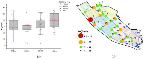 Spatial variations (a) and spatial distribution characteristics (b) of WQImin values in the 4 catchment areas (JXCA, XCCA, CLCA, and MJCA) of WWZ.