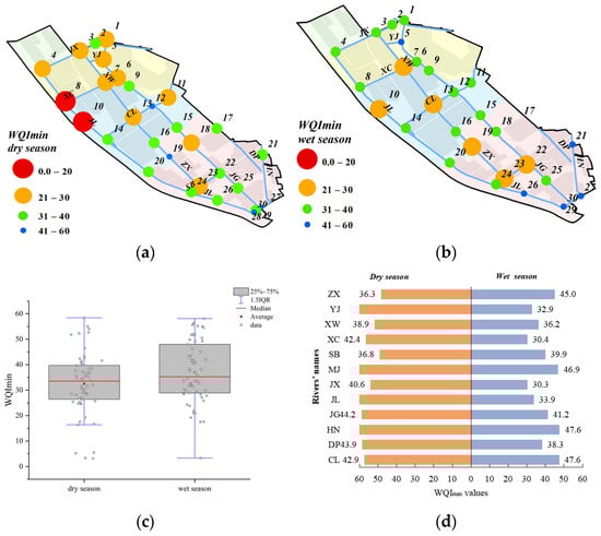 Spatial distribution characteristics of WQImin values in dry season (a), wet season (b), seasonal variations (c), and rivers’ seasonal variations (d) in WWZ.