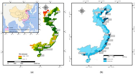 Geographical overview of Chinese mainland coastal provinces, cities, and BBRA pilot cities. (a) Geographical overview of Chinese coastal provinces and regions. (b) Locations of 16 BBRA pilot cities. Note: The maps are based on the standard map authorized by the Ministry of Natural Resources of the People’s Republic of China (Approval Number: GS (2019) 1823). The map approval number (GS (2019) 1823) can be found at http://bzdt.ch.mnr.gov.cn/ for verification (accessed on 15 November 2024). Note 2: The data regarding the coastal provinces and cities are sourced from the China Marine Economic Statistics Yearbook (2022).