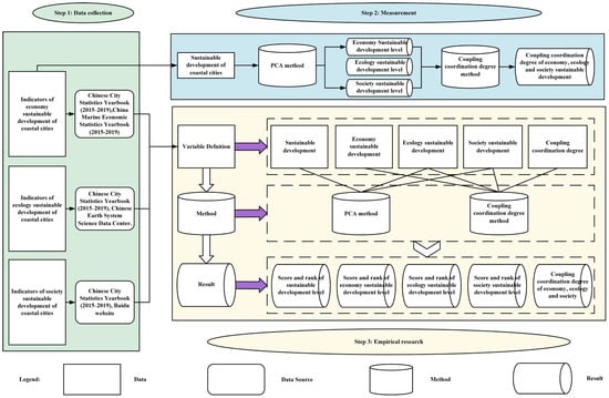 The principal component analysis (PCA) method is employed across various disciplines to evaluate sustainable development [,,,,], while the coupling coordination degree method (CCDM) is primarily used to demonstrate the interactions and influences among two or more systems [,]. This article utilizes PCA to evaluate the sustainable development levels—comprising economic, ecological, and social components—of 16 pilot cities within the BBRA framework. Furthermore, the coupling coordination degree model (CCDM) is employed to assess the interdependence of sustainable development across these three domains. The methodological and technological framework supporting this study is presented in Figure 2.