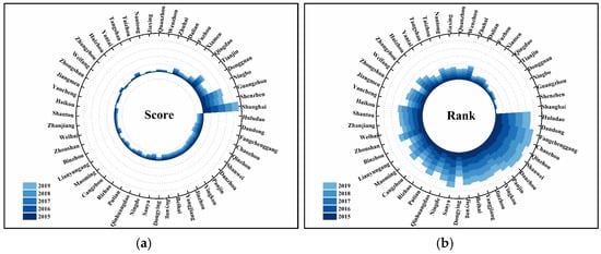 Based on the 39 indicators outlined above, a principal component model was developed to assess the sustainable development of 52 bay cities, considering economic, ecological, and social indices. The scores and ranks for these cities from 2015 to 2019 are presented in Figure 3. To present these results in a more geographical visual format, ArcGIS was utilized to illustrate the distribution and dynamic changes in the scores of bay cities, as shown in Figure 4.