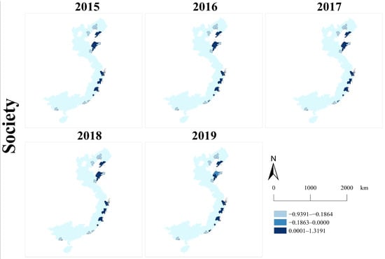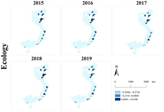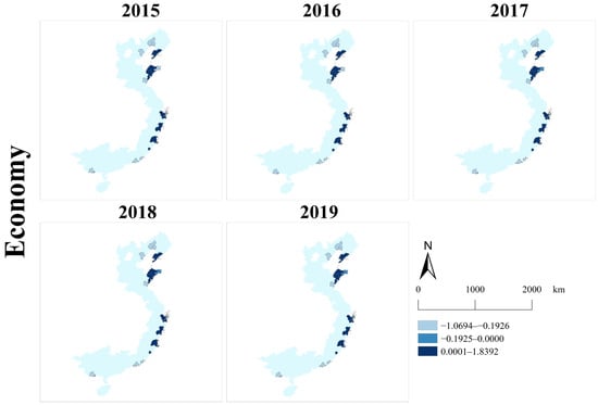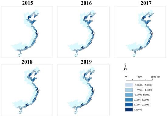 As demonstrated in Figure 4, the intensity of the color indicates the score level, with deeper colors representing higher scores. Some coastal cities have scores below 0, indicating that their sustainability performance falls below the average level. In 2019, the coastal cities represented in the darkest blue (with scores above 2) included Shanghai, Shenzhen, Guangzhou, Ningbo, Dongguan, and Tianjin. The most notable change observed in this figure is the elimination of the score between −3 and −2 (indicated in the lightest blue) in the year 2019. However, from 2015 to 2019, the variations in scores and rankings for the majority of the coastal cities were not prominent. Additionally, it is clear that cities with positive scores demonstrate a clustering trend.