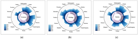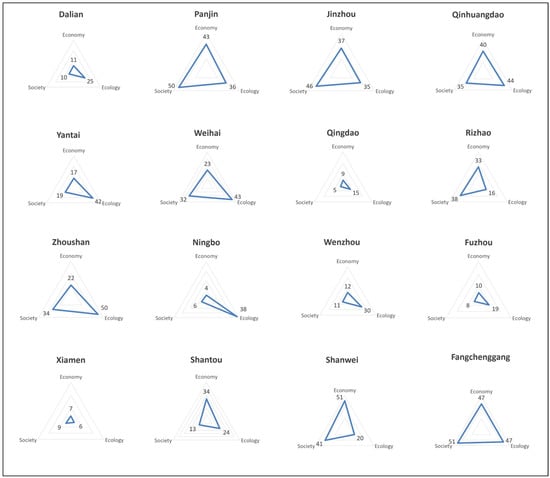 Among the 16 pilot cities of BBRA, Dalian was the highest ranking in the societal component, whereas its lowest ranking was in the ecological category. This trend was similarly observed in Qinhuangdao, Qingdao, Wenzhou, and Fuzhou. Conversely, for Panjin, Jinzhou, Rizhao, and Xiamen, the highest ranking was the ecological component, while the societal component ranked the lowest. In Yantai, Weihai, Zhoushan, and Ningbo, the economic component held the highest ranking, with the ecological component being the lowest. In Shantou, the societal component ranked the highest, whereas the economic component ranked the lowest. For Shanwei, the ecological component ranked highest, while the economic component ranked lowest. For Fangchenggang, all three components ranked lower than the others.