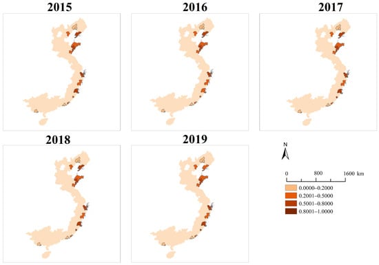 According to Figure 9, from 2015 to 2019, the coupling coordination degrees of Panjin, Jinzhou, Shanwei, and Fangchenggang were categorized as having low coupling coordination (0 < D ≤ 0.2). In contrast, the coupling coordination degrees of Qinhuangdao, Yantai, Weihai, Rizhao, Wenzhou, Fuzhou, Xiamen, and Shantou were of the moderate coupling coordination category (0.2 < D ≤ 0.5). During the same period, Ningbo exhibited a benign coordinated coupling (0.5 < D ≤ 0.8). Dalian experienced a shift from benign coordinated coupling to moderate coupling coordination in 2019, while Qingdao transitioned to moderate coupling coordination in 2016, then reverted to benign coordinated coupling in 2017, and kept it until 2019. Additionally, Zhoushan’s coupling coordination degree fluctuated, displaying low coupling coordination in 2015 and 2017 and moderate coupling coordination in 2016, 2018, and 2019.