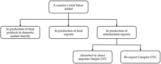 where each element in represents the value added from a source country/sector, directly or indirectly used in the production of final products and services in a particular country/sector. Equation (3) identifies the following four types of production activities: