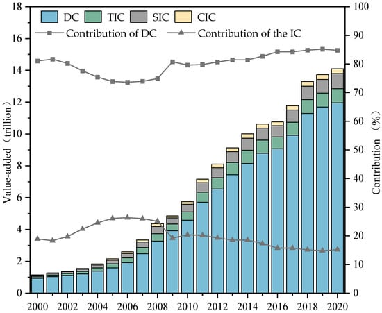 Value added and contributions of various circulations in China from 2000 to 2020.