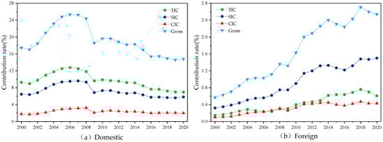 China’s IC affects domestic economies while simultaneously promoting foreign economies. Figure 3 displays the contributions of IC to both domestic and foreign economies from 2000 to 2020 at the route level. Figure 3a shows the contribution of IC to the domestic economy through exports. The trends for TIC, SIC, and CIC show similarities, with each route initially increasing before declining. This pattern may be attributed to China’s gradual emergence as the “world’s factory” following its accession to the WTO, during which it fully engaged in GVC division of labor. However, the global financial crisis in 2008 resulted in a significant drop in international demand, which adversely affected the domestic economy. Final exports through TIC initially encouraged China’s economic growth, with its contribution rising from 9.3% in 2000 to 11.8% in 2008. Subsequently, it plummeted to 9.6% in 2009, before gradually decreasing to 7.0% by 2020. The contributions of intermediate exports (SIC and CIC) were lower than those of final exports (TIC). Notably, the contributions of SIC gradually approached TIC, and by 2015, the combined contributions of SIC and CIC surpassed that of TIC. Because both SIC and CIC refer to intermediate trade, this trend suggests a notable shift due to the fact that the roles of intermediate and final exports have become equally significant. Furthermore, the contribution of SIC was always higher than that of CIC, with contributions of 5.7–6.4% and 1.8–2.1%, respectively. The more complex the GVC of an export route, the more subsequent production processes there are, and the closer exporters are to the upstream of the production chains [49]. Therefore, the production chains of China’s intermediate exports are mainly located in the downstream area of the GVC.