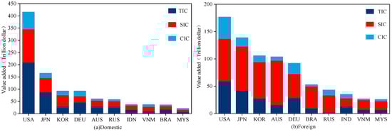 Figure 4 illustrates the impact of China’s IC on both domestic and foreign economies. The representative countries were chosen based on the top ten highest trade scales. In Figure 4a, the impact of IC through exports on the domestic economy in 2020 is depicted. The data indicate that the value added generated by China’s exports to the United States is the highest, totaling USD 41.55 trillion, significantly surpassing that of other countries. Japan follows as the second largest recipient, with exports valued at USD 16.59 trillion, which is only 40.0% of the amount for the United States. Among the top five countries contributing to China’s economic growth via IC, four are developed nations—namely Japan, the United States, Germany, and Australia—mainly influencing China’s economy through TIC. In contrast, the bottom five countries, which include Russia, Indonesia, Vietnam, and Malaysia, primarily enhance China’s economic growth through SIC.