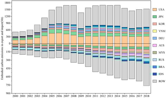 The lower section of Figure 5 illustrates the carbon emissions embodied in China’s imports, which are consistently lower than those of exports, ranging from 0.22 to 0.47 times the emissions of exports. This distinction primarily arises from the differences in factor endowments between China and each trade partner. China’s labor endowment has led the country to predominantly produce export products that are labor-intensive, low-value added, and high-carbon intensity. Conversely, the products that China imports are mainly high-tech and low-carbon-intensity [50]. Overall, the carbon emissions embodied in imports increased from 181.53 Mt to 762.4 Mt over the study period. There were minor fluctuations in emissions during 2005–2006 and 2015–2016, but an overall increase was observed throughout the remaining years. At the country level, excluding the ROW, Russia was the leading source of carbon emissions embodied in China’s imports before 2006, followed closely by Korea. However, since 2006, Korea has emerged as the largest source country. This shift can be attributed to geographical proximity and the strong complementarity between the two countries in terms of natural resources, labor, and export structures. Consequently, economic exchanges and cooperation between China and Korea gradually expanded, resulting in significant growth in carbon emissions embodied in imports from Korea [51].