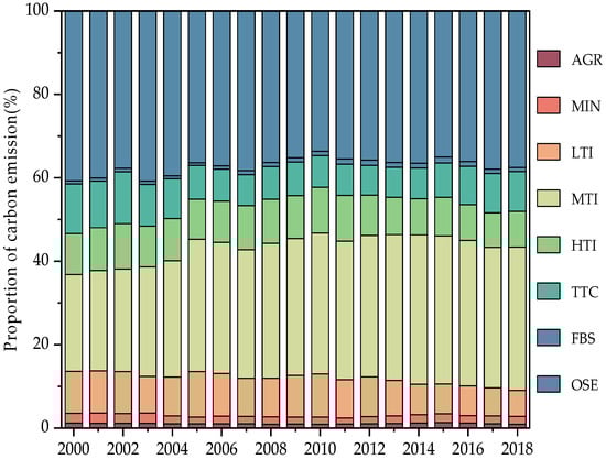The sector’s proportion of carbon emissions embodied in China’s IC through exports from 2000 to 2018.