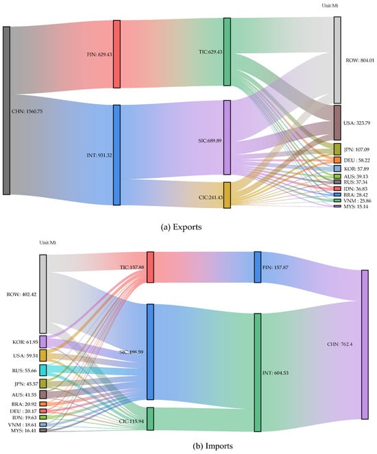 Based on the analysis of embodied carbon emissions at the overall level, this study further measures the flow and transfer of embodied carbon emissions in China’s IC at the route level. Figure 7a maps the flow of carbon emissions embodied in China’s IC through exports for 2018. The total carbon emissions embodied in China’s exports were 1532.89 Mt, which included 941.71 Mt from intermediate exports and 629.43 Mt from final exports. This is because of the global production chain revolution, which has made intermediate trade the mainstream of international trade, and China is gradually integrating into the division of labor within the GVC [54]. Regarding the cross-border frequency of intermediate products, carbon emissions from intermediate exports can be categorized into two parts: SIC, contributing 689.89 Mt, and CIC, contributing 214.43 Mt. SIC is the primary contributor to carbon emissions embodied in China’s exports, accounting for 44.2% of total carbon emissions. This is because SIC concentrates on lower-tech industries with high energy consumption, and their intermediates cross an international border only once, which shortens the length of the production chain and reduces the technical difficulty of production, thereby facilitating participation by less-industrialized economies [55]. The carbon emissions embodied in China’s exports to the United States through these three routes were the highest, totaling 145.73 Mt for TIC, 120.52 Mt for SIC, and 57.54 Mt for CIC. This was followed by Japan, which accounted for emissions of 47.54 Mt, 44.36 Mt, and 15.19 Mt through the same routes.