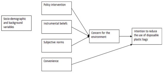 Additionally, a correlation is expected between sociodemographic factors such as gender, age, and education level, and the intention to reduce plastic bag consumption. The proposed model is described in Figure 1.
