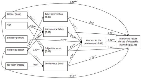 Path analysis for the intention to reduce use of disposable plastic bags, with concern for the environment, attitudes toward policy intervention, instrumental belief, subjective norms, and convenience. * p < 0.05, ** p < 0.01, *** p < 0.001. Note. Values on arrows—β values; values within the rectangles—R2. Non-significant associations with the demographic and background variables were excluded from the analysis; all other associations were included. Income and number of persons in the home had no significant associations and were thus removed from the model.