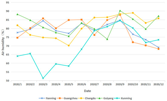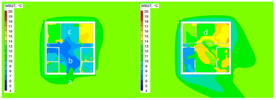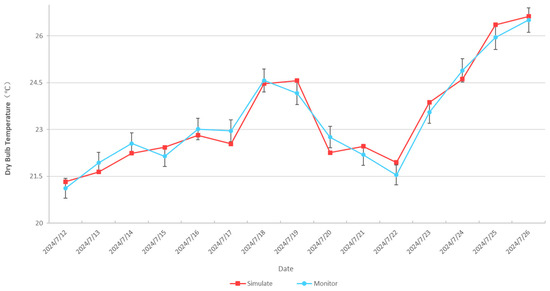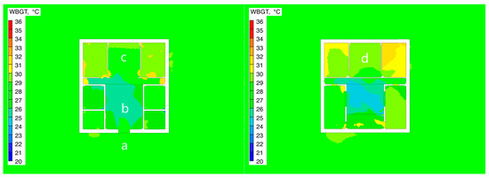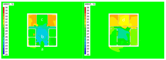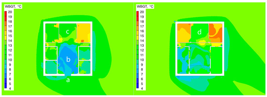This phenomenon indicates that, under the influence of solar radiation and the coupling effect of the skywell ventilation structure, a significant temperature and humidity gradient forms in the second-floor space. The extreme low temperature (≤5.49 °C) and low humidity (≤37.60%) values fell below the lower threshold of the ASHRAE comfort zone, requiring targeted adjustments in the building’s thermal design.