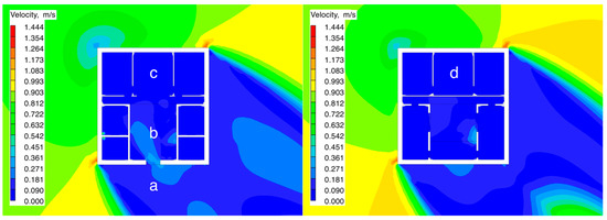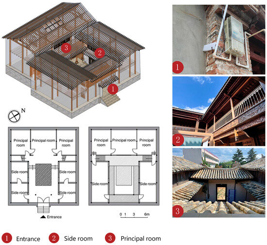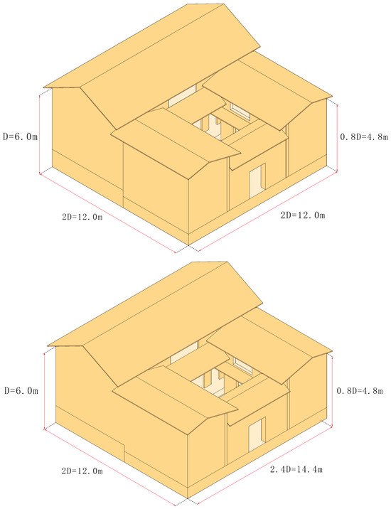 In summary, under the summer wind conditions, the distribution of wind speed and humidity in the three typical areas of the two-story “Yikeyin” building exhibited notable spatial variability. The results showed a positive correlation between the size of the skywell and wind speed, where larger skywell dimensions lead to higher wind speeds and lower humidity. This finding further supports the idea that increasing the size of the skywell significantly improves the moisture control effect during the summer, offering a crucial theoretical foundation for the spatial optimization of traditional buildings (shown in